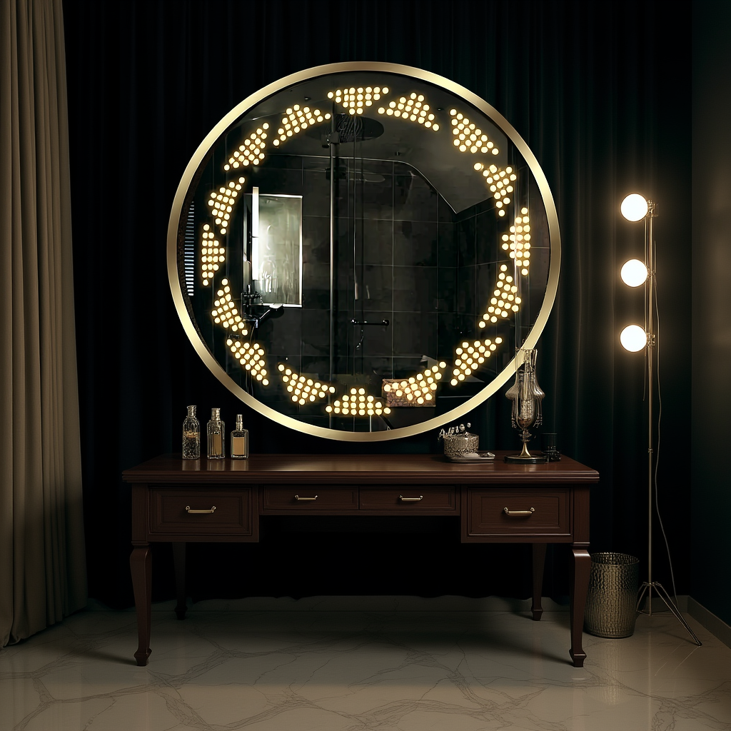 Circular LED Mirror India with an illuminated LED ring. Perfect for modern bathrooms, grooming areas, and luxury vanities, providing bright, even lighting for detailed tasks.