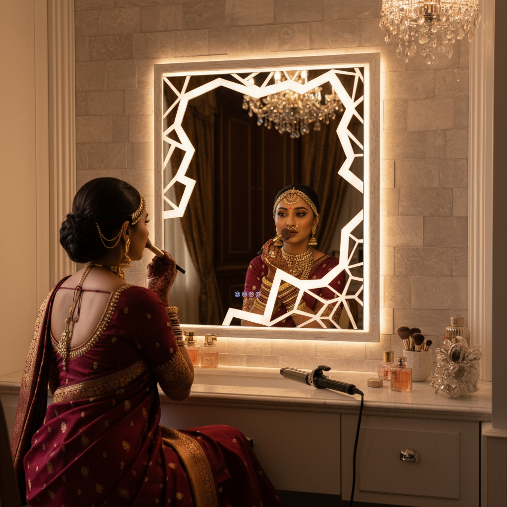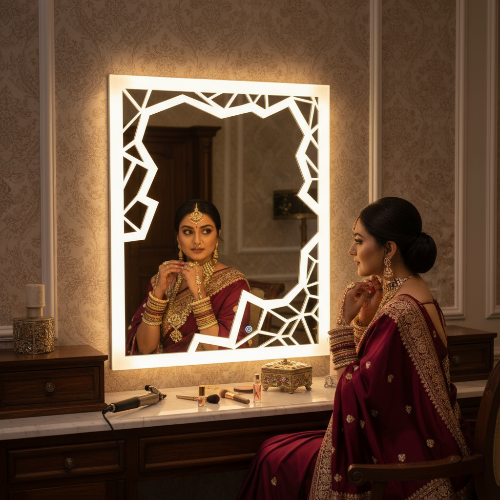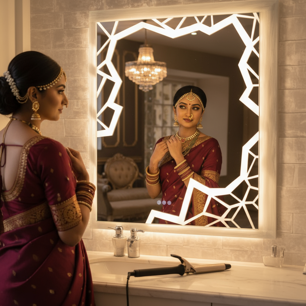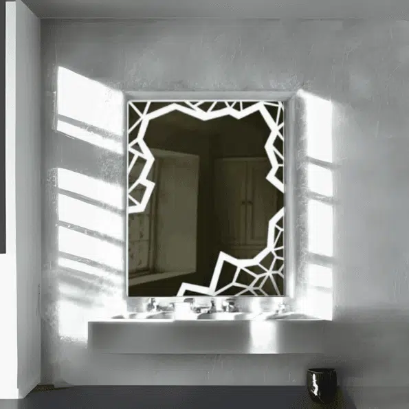 Unlike standard LED mirrors, this one features a geometric frosted LED mirror border designed to grab attention. The sharp, angular pattern etched into the frosted glass glows with warm LED backlighting. This creates a dramatic yet elegant atmosphere, offering both ambient light and practical illumination for everyday grooming, makeup, or skincare.