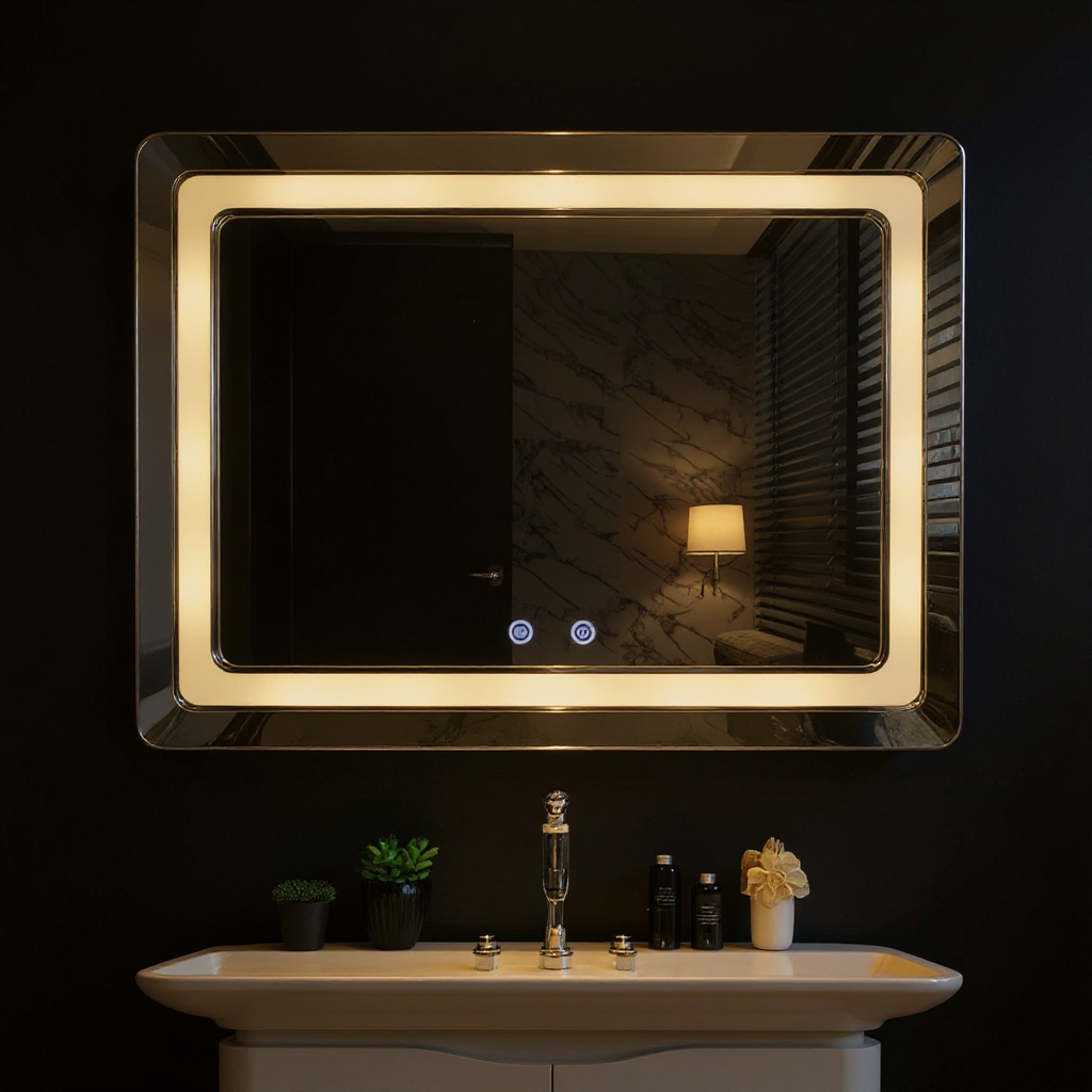 Modern rectangular LED mirror with dual touch controls, defogger, and soft white lighting—perfect for luxury bathrooms and vanity setups.