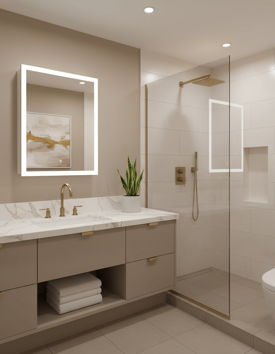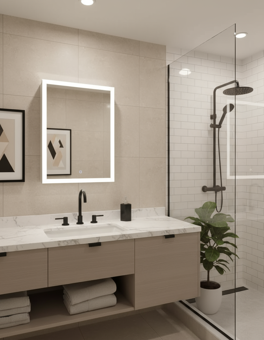 Rectangular LED Mirror India with illuminated LED border, perfect for modern bathrooms, vanity spaces, and grooming stations. Offers bright, even lighting for all your grooming needs.