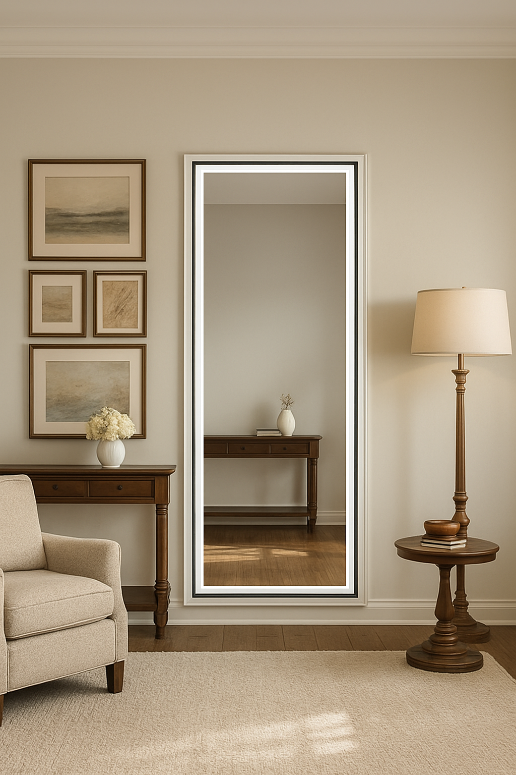 Equipped with integrated LED lights, this mirror ensures bright, even illumination across your entire reflection. The LED lighting eliminates shadows and highlights every detail, making it ideal for grooming, styling, and fashion planning. The backlit glow is designed to provide the right amount of light, helping you look your best no matter the time of day.