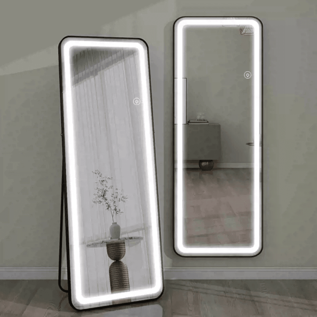 Premium full-length LED mirror with warm white border light, touch sensor, and dual mounting options. Ideal for dressing rooms and bedrooms.