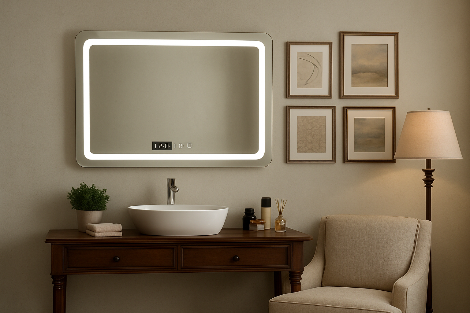 Illuminated LED Mirror India with a sleek rectangular design and soft LED border lighting. Perfect for modern bathrooms, vanities, and grooming areas.