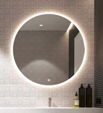 Modern round LED mirror with halo glow, anti-fog technology, and touch control—ideal for sleek bathroom designs and vanity setups.