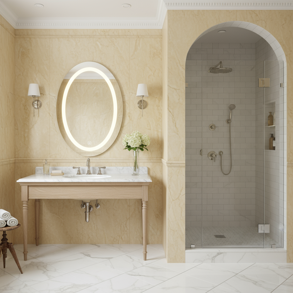Modern Designed LED Oval Bathroom Mirror – Sleek Illuminated Mirror with Touch Sensor and Anti-Fog Feature