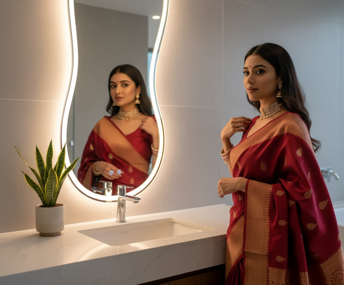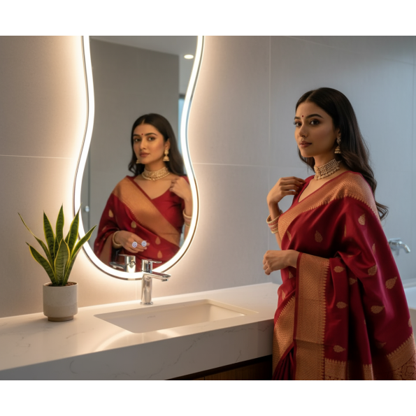 Circular LED Mirror India with an illuminated LED ring. Perfect for modern bathrooms, grooming areas, and luxury vanities, providing bright, even lighting for detailed tasks.