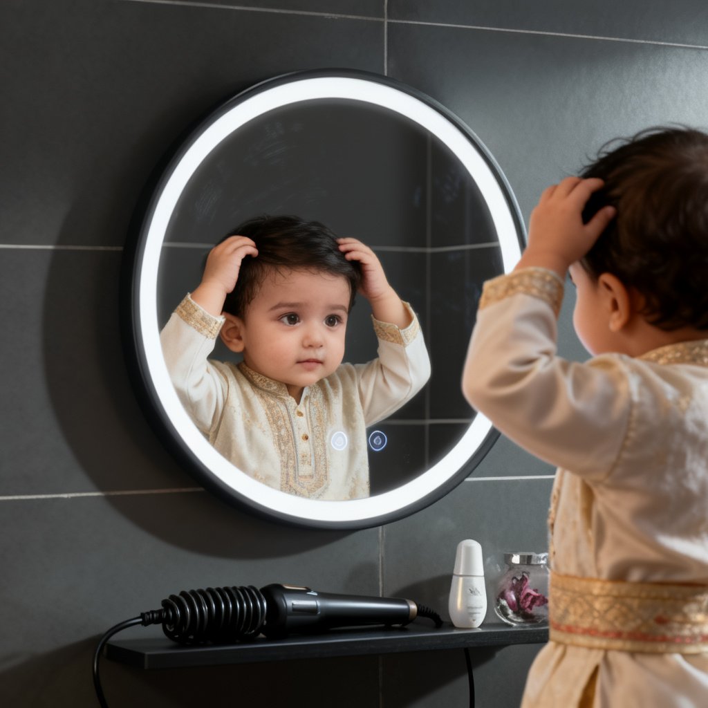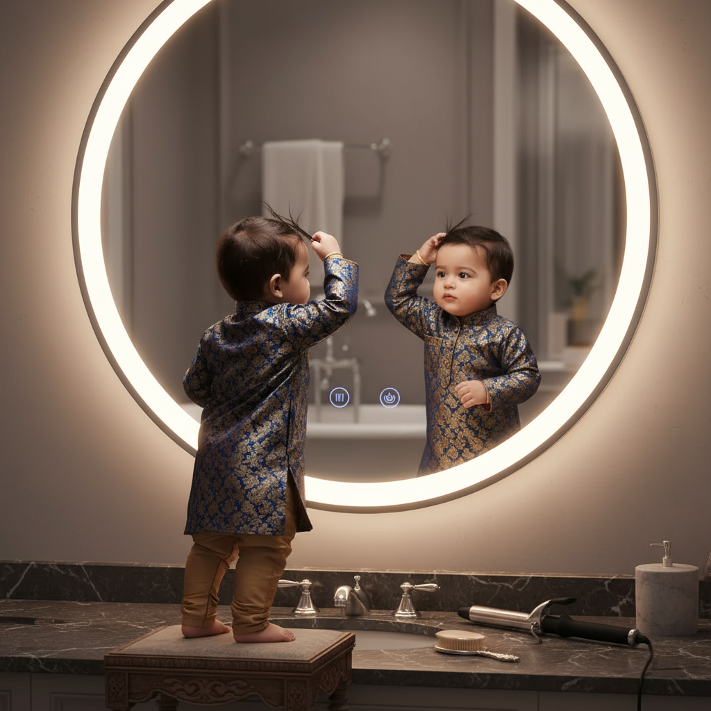 Circular LED Mirror India with an illuminated LED ring. Perfect for modern bathrooms, grooming areas, and luxury vanities, providing bright, even lighting for detailed tasks.