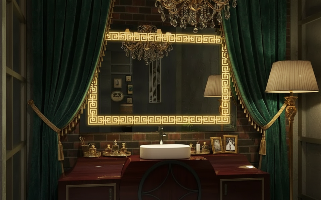 Golden Border LED Mirror India with backlit design. Ideal for modern bathrooms, luxury vanities, and elegant interior spaces.