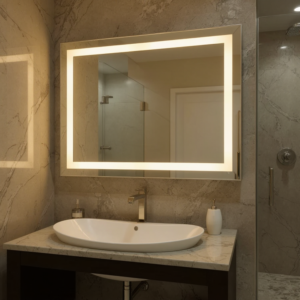 Rectangular LED Mirror India with a glowing edge, perfect for bathrooms, salons, and modern interiors. Frameless design with energy-efficient LED lights.
