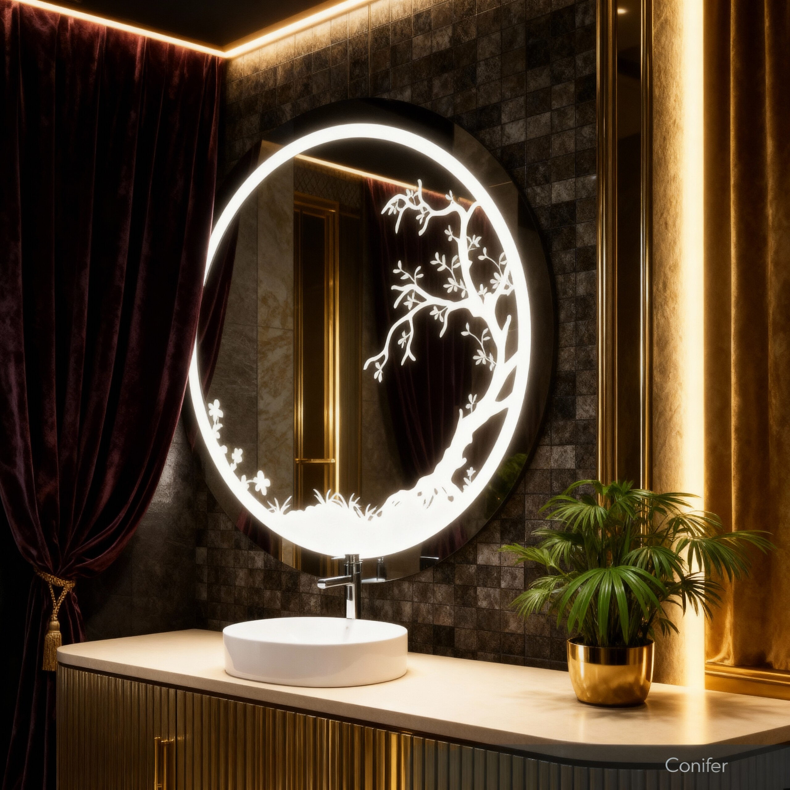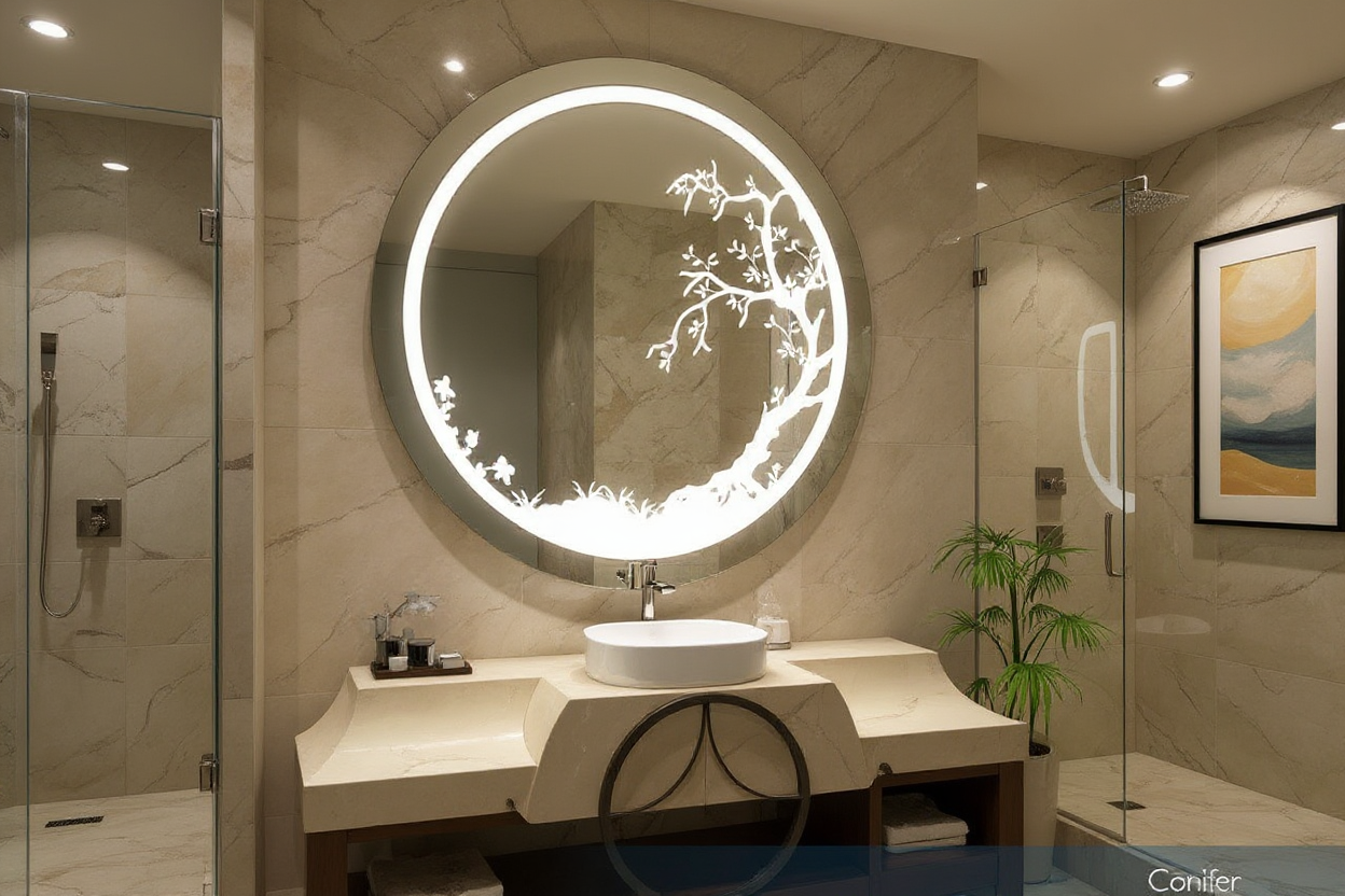 Circular LED Mirror with Artistic Tree Design and Ambient Lighting